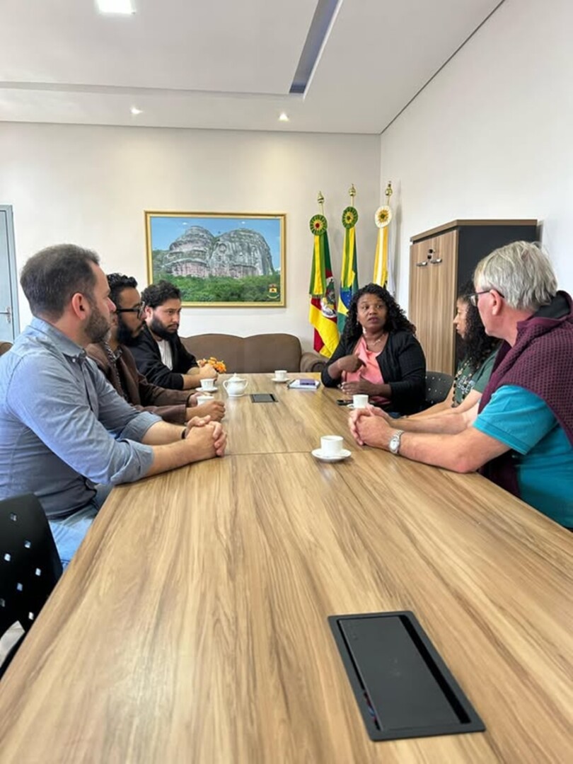 Na manhã de sexta-feira, 14 de março, o prefeito Marcelo Spode e o Secretário de Inovação, Cultura e Turismo Ignácio Lemos receberam a Coordenadora Municipal de Promoção da Igualdade Racial de Caçapava do Sul, Cátia Cilene Morais Dutra, e o estagiário Luiz Felipe de Oliveira e os coordenadores do Núcleo de Estudos Afro-Brasileiro e Indígenas (NEABI) da UFSM Angela Souza e Anderson Machado.