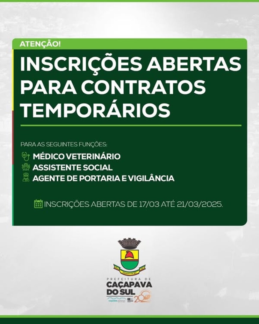 Inscrições até 21 de março na Secretaria de Administração. Acesse o edital no site da prefeitura: https://cacapavadosul.rs.gov.br/