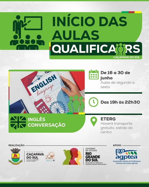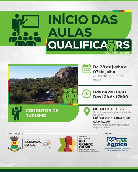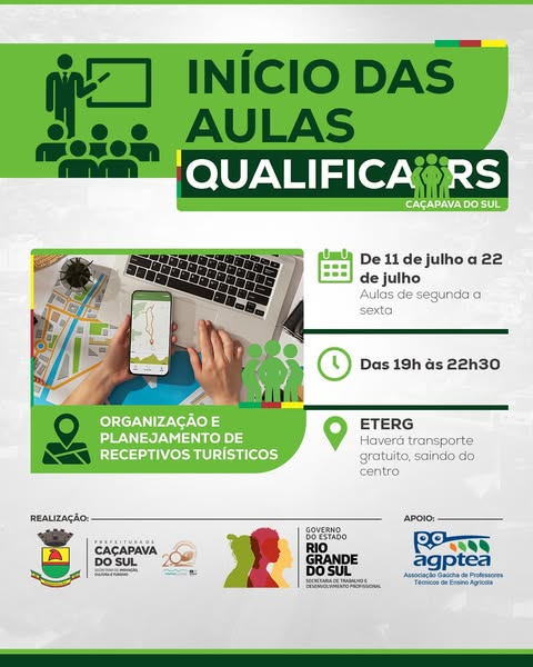 A partir da próxima semana, Caçapava do Sul dá início às aulas de três cursos gratuitos oferecidos pelo programa Qualifica RS, uma parceria entre a Prefeitura através da Secretaria de Inovação, Cultura e Turismo, o Governo do Estado e a Associação Gaúcha de Professores Técnicos de Ensino Agrícola (AGPTEA). As capacitações são voltadas para o setor de turismo e para o desenvolvimento profissional da comunidade.