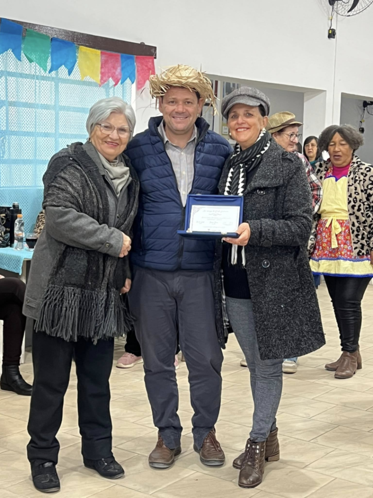 Na abertura da festa, o prefeito Marcelo Spode, o vice-prefeito Maiano Teixeira e a secretária de Desenvolvimento Social, Cristina Spode, realizaram um ato de reconhecimento e valorização do trabalho coletivo. Eles entregaram uma placa de homenagem ao Grupo Amigos da Melhor Idade, em agradecimento pelo comprometimento, reconhecendo todo o carinho, empenho e dedicação nas ações de melhoria e reforma do clube.