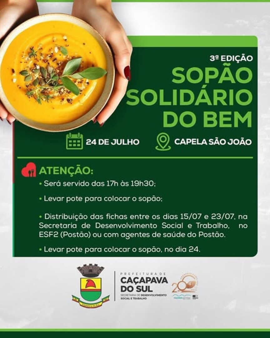Importante: as fichas para garantir a refeição serão distribuídas a partir de hoje até terça-feira, dia 23 de julho, na SEDEST, no ESF 2 (Postão) ou com as agentes de saúde desta região. E lembre-se: é necessário levar um recipiente para retirar o sopão.