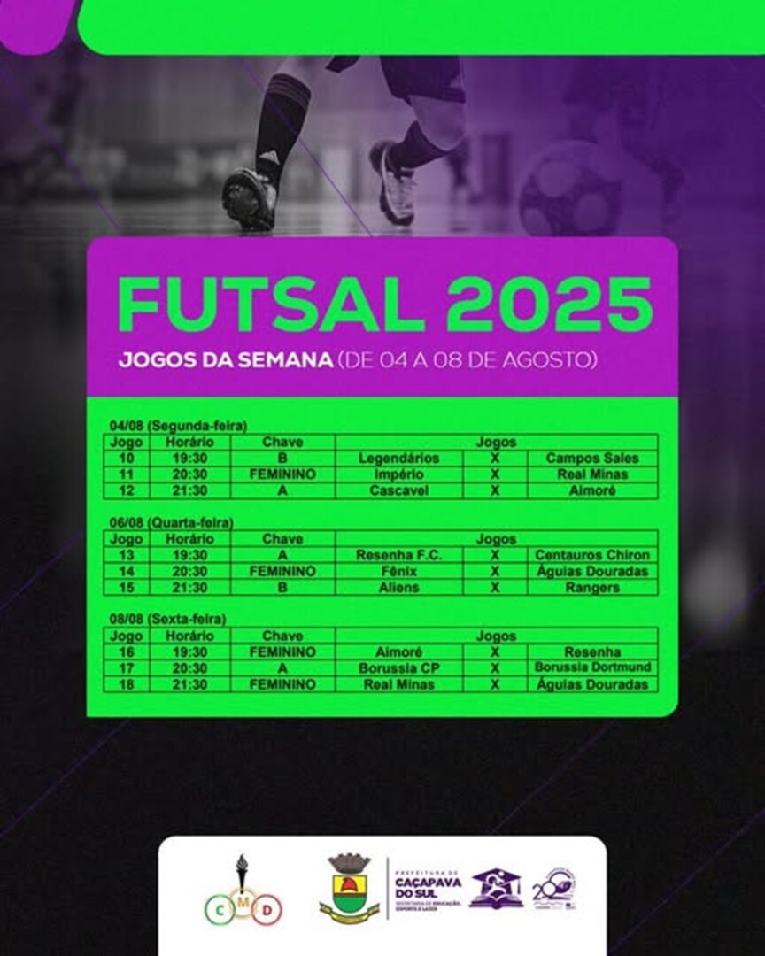 Acompanhe os Jogos da Semana Esportes Geral Prefeitura de Caçapava do Sul 5 de agosto de 20255 de agosto de 2025redacao CaçapavaLeave a Comment on Acompanhe os Jogos da Semana Confira a tabela das partidas do Campeonato Municipal de Futsal entre os dias 4 e 8 de agosto. Serão partidas nas categorias masculina e feminina, a partir das 19h30min. Venha torcer pelo seu time e apoiar o esporte local! Compartilhe