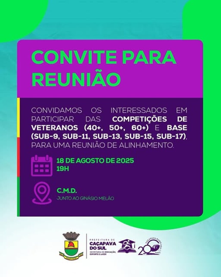 O Conselho Municipal de Desporto (CMD) convida atletas e representantes das categorias veteranos (40+, 50+ e 60+) e base (Sub-9, Sub-11, Sub-13, Sub-15 e Sub-17) para uma reunião de alinhamento sobre as próximas competições esportivas do município.