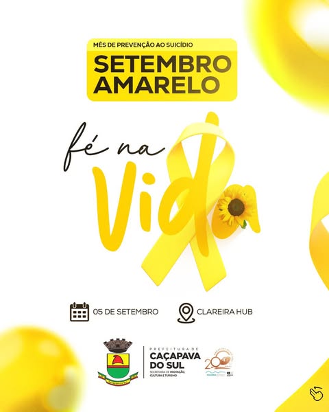 A Secretaria de Inovação, Cultura e Turismo de Caçapava do Sul promove, na sexta-feira, 5 de setembro, o evento “Setembro Amarelo – Fé na Vida”, em alusão ao mês de prevenção ao suicídio. A atividade acontece no Clareira Hub e conta com uma programação durante todo o dia, reunindo palestras, oficinas, apresentações culturais e momentos de reflexão.