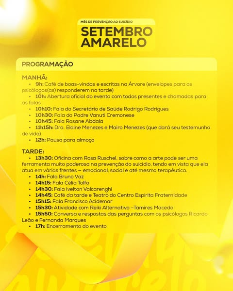 “O Setembro Amarelo é um convite à reflexão e ao cuidado coletivo. Precisamos abrir espaços de escuta e mostrar que ninguém está sozinho. Este evento é uma forma de aproximar a comunidade, promovendo informação, apoio, acolhimento e valorização da vida”, destacou o Secretário de Inovação, Cultura e Turismo Ignácio Lemos.