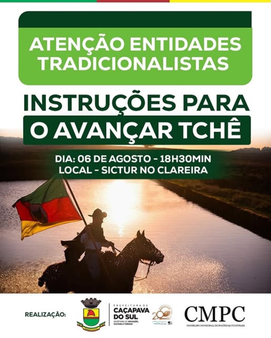 A Secretaria de Inovação, Cultura e Turismo convida as entidades tradicionalistas para reunião na quarta-feira, 6 de agosto, às 18h30min, na SICTUR, no Hub Clareira.