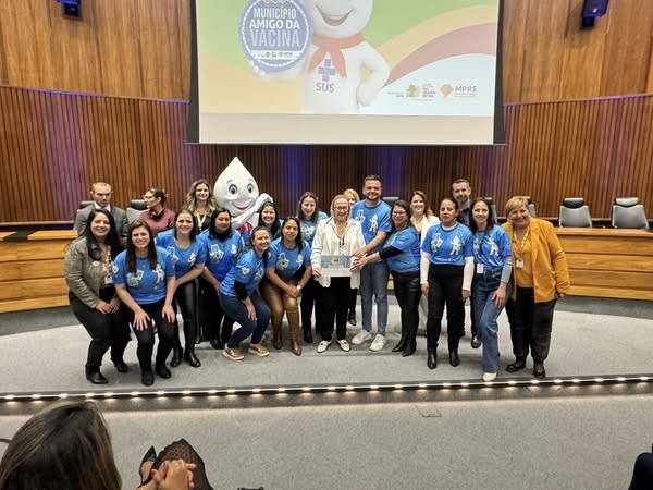 Em cerimônia realizada no auditório do Ministério Público, em Porto Alegre, o município recebeu, pelo segundo ano consecutivo, o Selo Ouro de Município Amigo da Vacina.