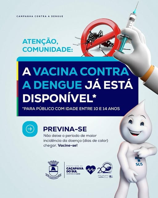 Vacina contra a dengue disponível! Geral Prefeitura de Caçapava do Sul Saúde 19 de agosto de 202519 de agosto de 2025redacao CaçapavaLeave a Comment on Vacina contra a dengue disponível! Atenção, comunidade: a vacina está disponível para crianças e adolescentes de 10 a 14 anos. Não deixe para depois! Proteja-se antes do período de maior incidência da doença. Procure a unidade de saúde mais próxima e vacine-se! Compartilhe