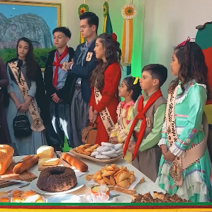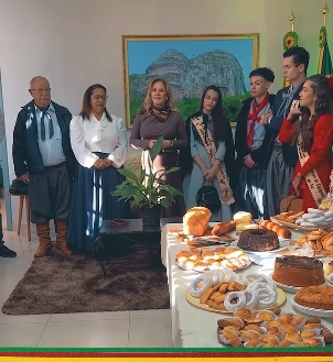 Na manhã da sexta-feira, dia 12, a primeira dama Cristina Spode organizou um café campeiro em recepção ao patrono da Semana Farroupilha 2025, Flavio Chaves, e as prendas e peões do município.