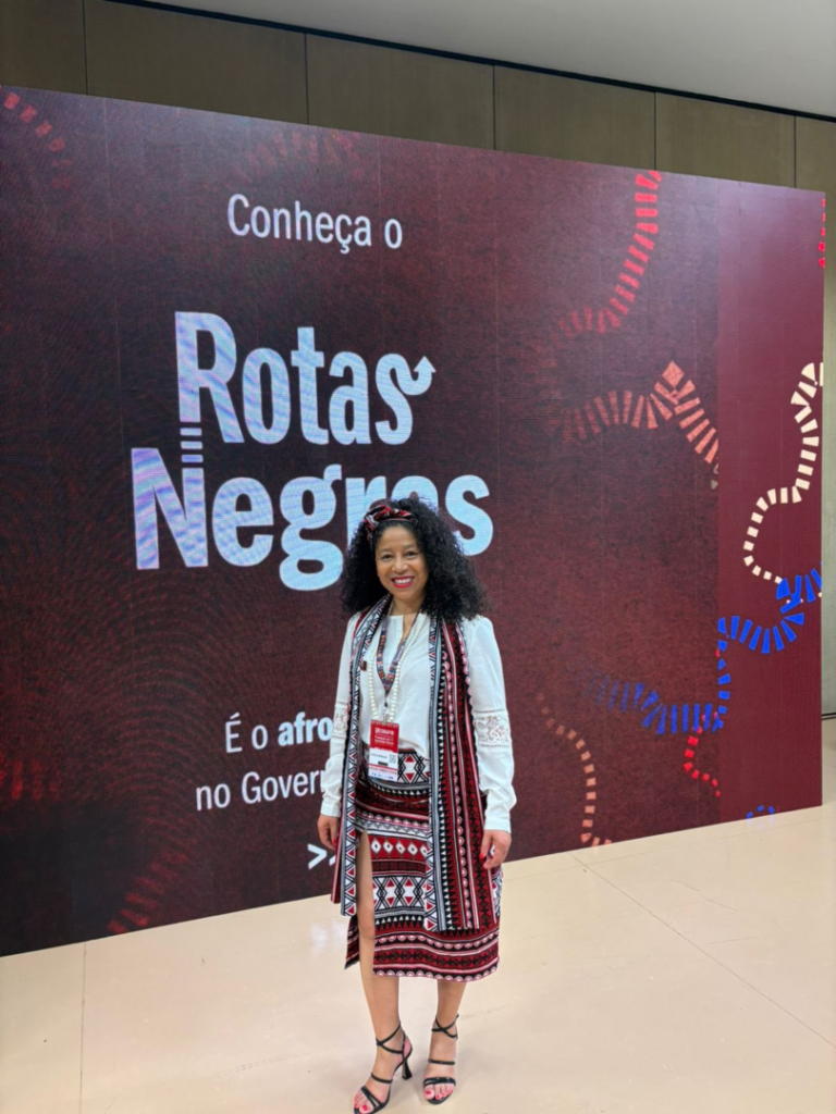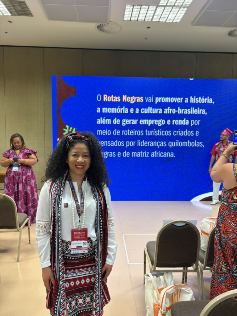 Durante o primeiro dia de atividades, Cátia realizou o credenciamento, participou do acolhimento, fez a inscrição nos eixos temáticos e integrou o Xirê do Programa Rotas Negras — ação promovida em parceria com o Ministério da Promoção da Igualdade Racial, Ministério do Turismo, Ministério da Cultura e EMBRATUR.