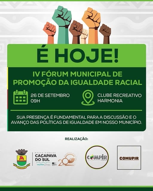 Na sexta-feira, 26 de setembro, a partir das 9h, será realizado o IV Fórum Municipal de Promoção da Igualdade Racial, no Clube Recreativo Harmonia.