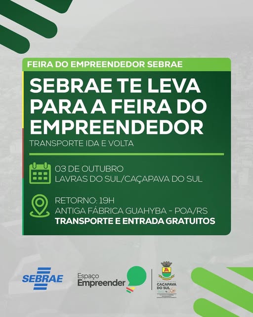 No dia 3 de outubro, os empreendedores de Caçapava do Sul terão a oportunidade de participar da Feira do Empreendedor Sebrae, em Porto Alegre. O evento será realizado na antiga Fábrica Guahyba.