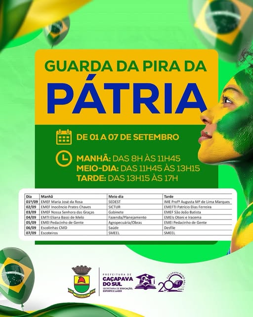 A Prefeitura de Caçapava do Sul, por meio da Secretaria Municipal de Educação, Esporte e Lazer (SMEEL), divulgou a programação da Guarda da Pira da Pátria, que acontece de 1º a 7 de setembro, em alusão à Semana da Pátria.