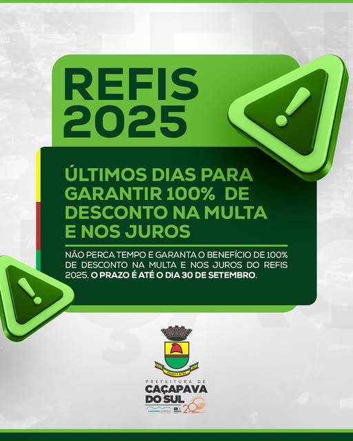 A Prefeitura de Caçapava do Sul comunica aos contribuintes que está nos últimos dias do prazo de adesão ao Refis 2025. Até o dia 30 de setembro, é possível regularizar débitos tributários com 100% de desconto em juros e multas.