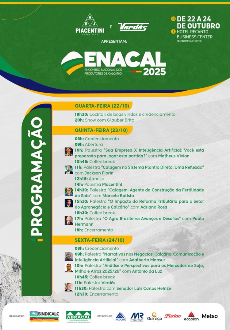 Com abrangência nacional e participação gratuita, o Enacal é promovido pelo Sindicato da Indústria de Calcário do Estado do Rio Grande do Sul (Sindicalc) e pela Associação Brasileira dos Produtores de Calcário Agrícola (Abracal).