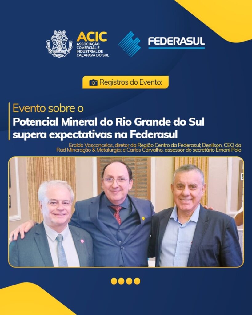 Nos dias 7 e 8 de outubro, aconteceu na Federasul, em Porto Alegre, um importante evento voltado à discussão do potencial mineral do Rio Grande do Sul. Evento organizado e coordenado pelo presidente da ACIC e Diretor da Federasul Eraldo Vasconcelos. Após dias de preparativos, reuniões e articulações, o encontro superou as expectativas de todos os participantes.