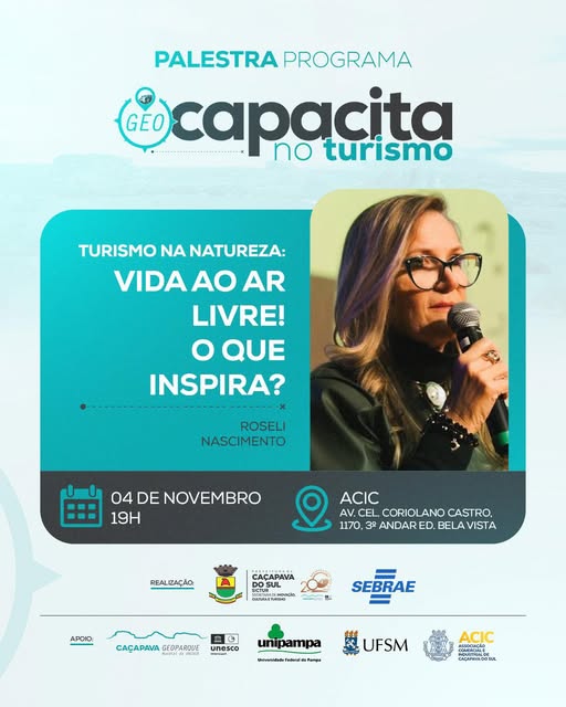 Na próxima terça-feira, 4 de novembro, acontece mais uma atividade do programa Geocapacita no Turismo, com a palestra “Turismo na Natureza: Vida ao ar livre! O que inspira?”, ministrada por Roseli Nascimento. O encontro será realizado na ACIC, às 19h, e é aberto a profissionais, estudantes e interessados no setor turístico.