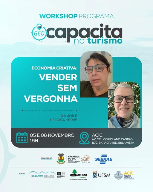 Nos dias 5 e 6 de novembro, o programa Geocapacita no Turismo promove o workshop “Vender sem Vergonha”, com Bia Job e Heloisa Hervé, na ACIC, a partir das 19h. A atividade é voltada a empreendedores, artistas, artesãos e profissionais da economia criativa que desejam fortalecer suas habilidades de comunicação e valorização do próprio trabalho.