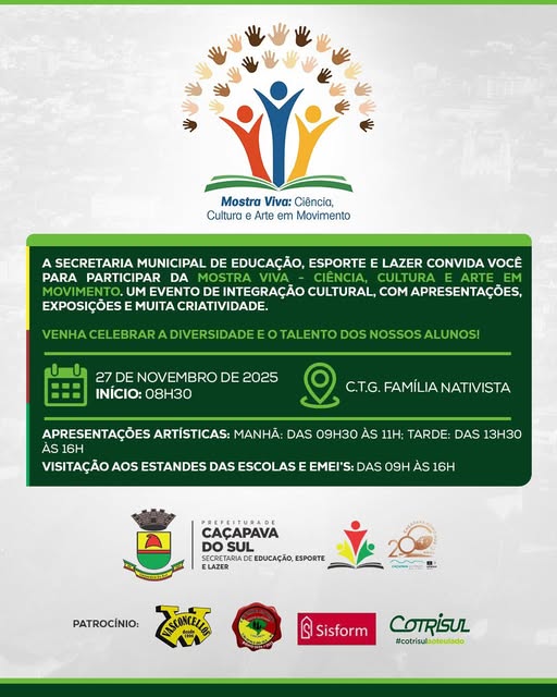 A Secretaria Municipal de Educação, Esportes e Lazer promove, no dia 27 de novembro, a Mostra Viva – Ciência, Cultura e Arte em Movimento, um evento que reúne diversidade, criatividade e talento dos alunos da rede municipal.