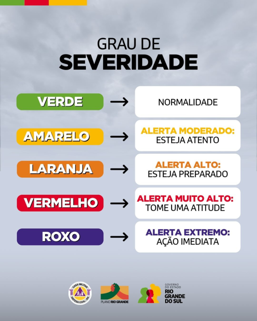 Em função das chuvas intensas previstas para o estado, com precipitações moderadas a altas em um curto período de tempo, é indicada a condição de ATENÇÃO e ALERTA para as cidades em amarelo e laranja no mapa hidrológico, respectivamente, atentando para a elevação rápida com alto risco de cheias em arroios e pequenos rios, assim como enxurradas em regiões de maior declividade, além disso podem ocorrer fortes alagamentos em perímetros urbanos conforme a intensidade das chuvas.