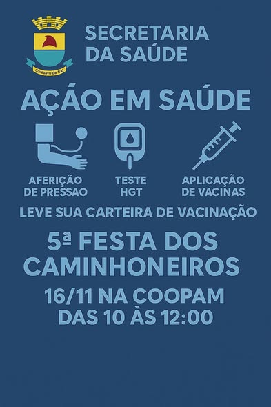 A Secretaria de Saúde estará presente na 5ª Festa dos Caminhoneiros, que acontece no próximo domingo, dia 16 de novembro, no Parque da Coopam, em Caçapava do Sul.