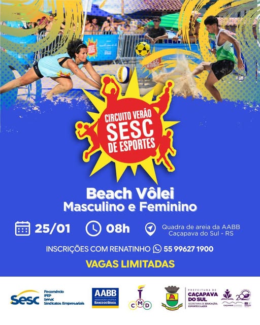 Caçapava do Sul recebe, no dia 25 de janeiro, a partir das 8 horas, mais uma etapa do Circuito Verão SESC de Esportes, com a realização do torneio de Beach Vôlei masculino e feminino. A competição acontece na quadra de areia da AABB, reunindo atletas e amantes do esporte em um evento que incentiva a prática esportiva e o lazer.