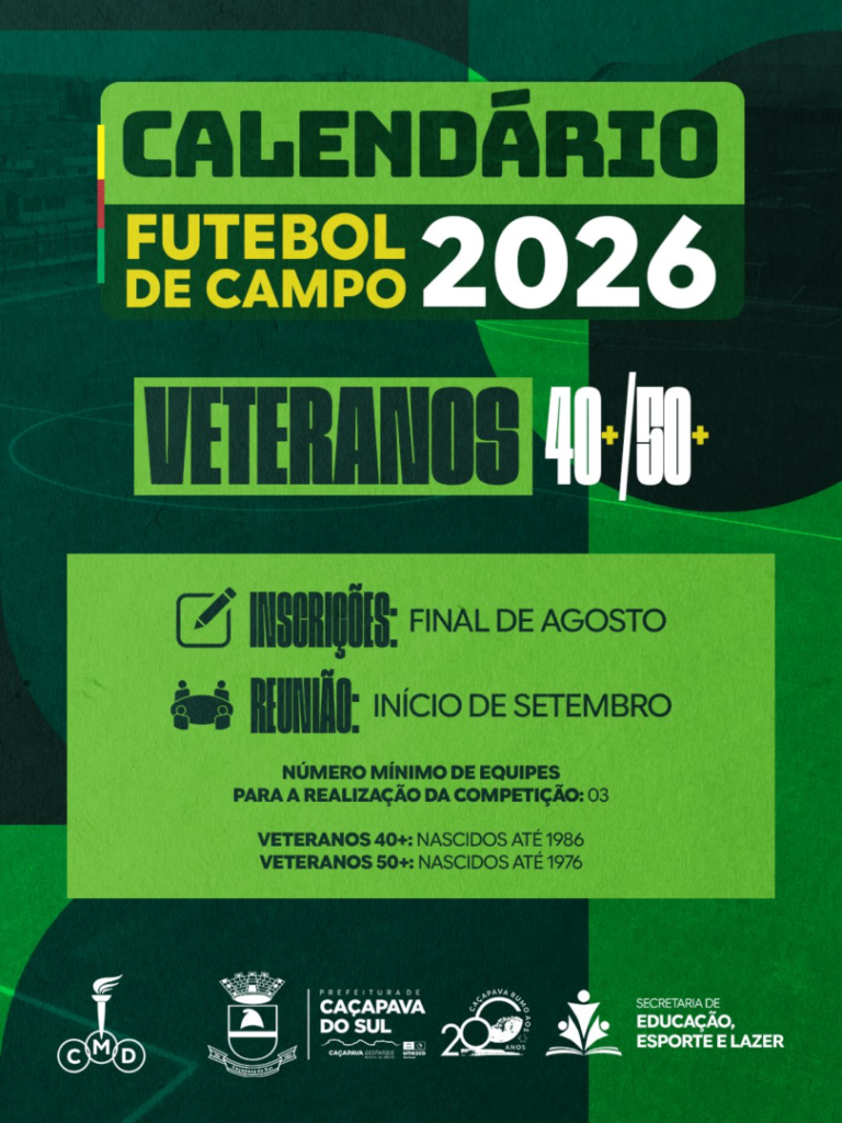 Confira a previsão de calendário das competições de 2026 Destaque Esportes Geral Prefeitura de Caçapava do Sul 16 de janeiro de 202616 de janeiro de 2026redacao CaçapavaLeave a Comment on Confira a previsão de calendário das competições de 2026 Compartilhe