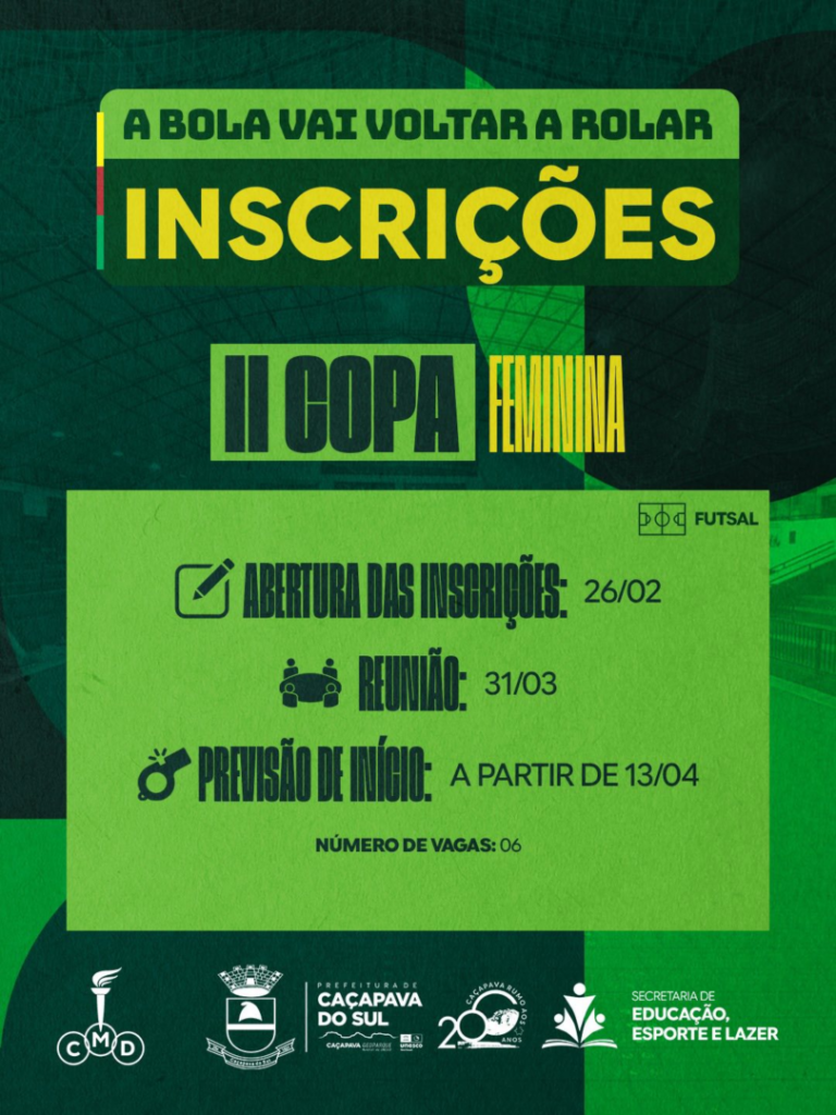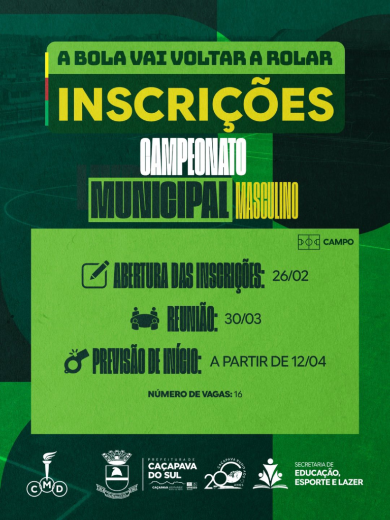 O Conselho Municipal de Desporto (CMD) inicia dia 26 de fevereiro, o período de inscrições para as competições do primeiro semestre de 2026. A etapa contempla o Campeonato Municipal de Futsal Série Prata, a II Copa Feminina de Futsal e o Campeonato Municipal de Futebol de Campo – Categoria Livre.