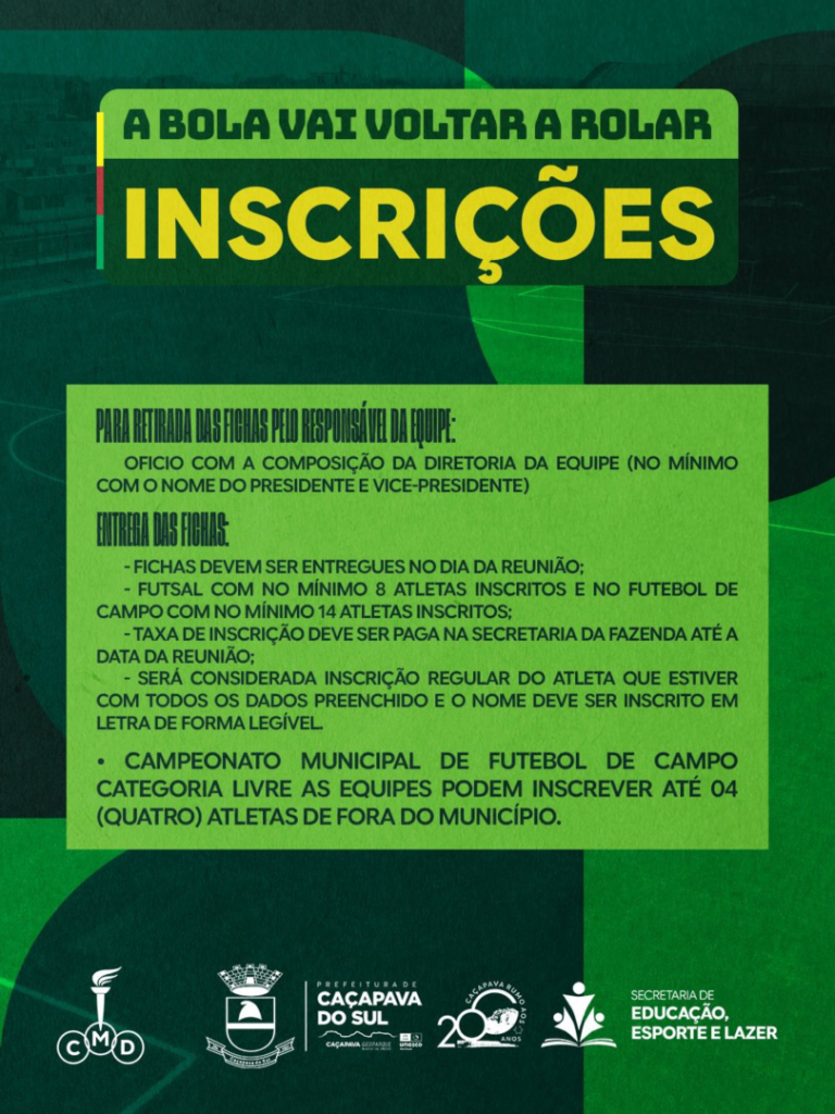 No Futebol de Campo, será permitida a inscrição de até quatro atletas de fora do município por equipe. Já no futsal, somente poderão participar atletas naturais de Caçapava do Sul ou que comprovem vínculo com o município, conforme regulamento.