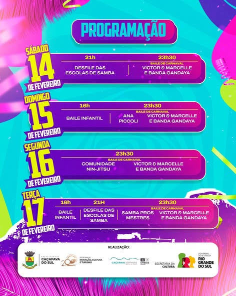 O Carnaval 2026 é uma realização da Prefeitura de Caçapava do Sul, por meio da Secretaria de Inovação, Cultura e Turismo, com apoio da Secretaria de Cultura do Estado.