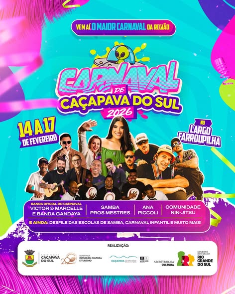 O Carnaval 2026 é uma realização da Prefeitura de Caçapava do Sul, por meio da Secretaria de Inovação, Cultura e Turismo, com apoio da Secretaria de Cultura do Estado.