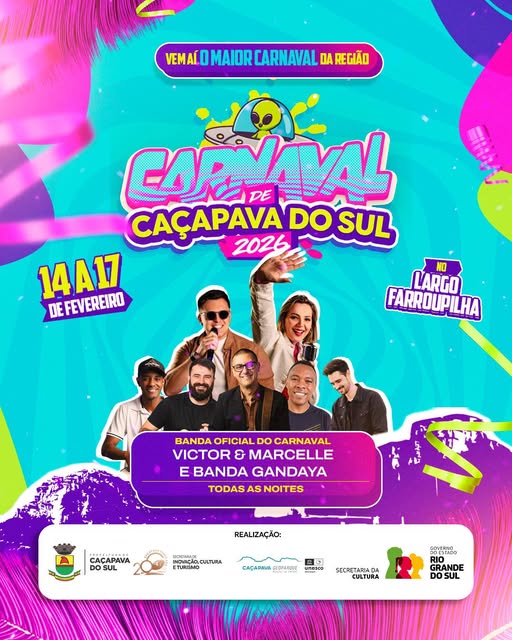 Serão quatro dias de festa, diversidade de ritmos, alegria e uma estrutura preparada para receber toda a comunidade com segurança e organização. O Carnaval 2026 é uma realização da Prefeitura de Caçapava do Sul, por meio da Secretaria de Inovação, Cultura e Turismo, com apoio da Secretaria de Cultura do Estado.