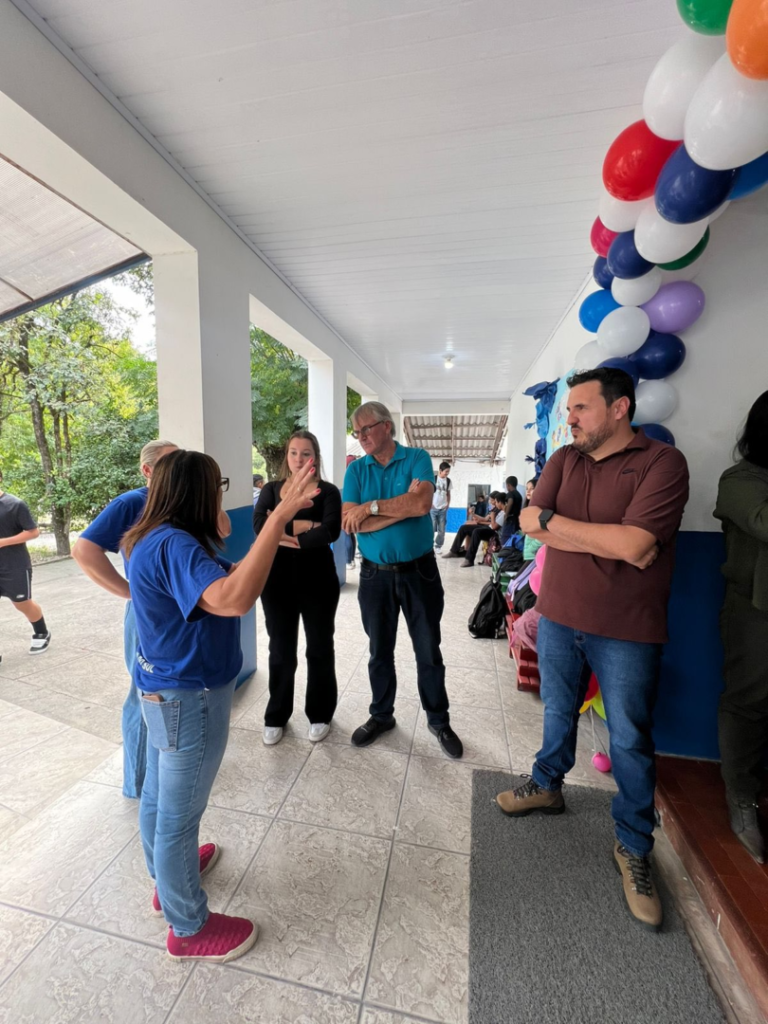 Estiveram presentes: o prefeito Marcelo Spode, o secretário de Gestão Dilvane Loreto Jaime, a secretária adjunta Valdirene Dutra, o secretário adjunto de Educação Edimar Fonseca, o chefe de gabinete Gabriel Benites e o vereador Silvio Tondo. Durante a visita, as autoridades conversaram com alunos e profissionais da escola, acompanhando de perto a rotina e as atividades desenvolvidas no local.